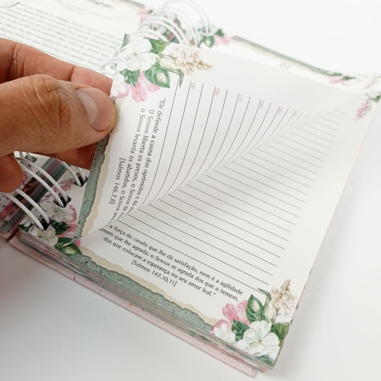 As tarefas das mulheres hoje são das mais variadas, pois alêm de cuidar de seus lares em muitos casos ainda trabalham fora, isso para não mencionar aquelas que ainda desenvolvem ministérios na igreja. Pensando nisso a editora Luz e Vida traz a agenda permanente Maravilhosa Graça, personalizada e que á cada Página há uma ilustração de ensino e instrução para as mulheres. Quanto ao acabamento não poderíamos imaginar nada melhor vindo de uma editora tão compromissada, com ilustrações floridas para trazer certa leveza e simplicidade, com tons e cores singelas, tudo em capa dura para dar resistência, durabilidade e consistência. Na primeira Página temos um pequeno espaço para guardar algumas anotações e folhetos, com um belo acabamento apresentado com leveza e ilustrações floridas. A agenda possui uma ficha onde a mulher poderá registrar seus dados pessoais, bem como telefone, endereço entre outras informações importantes. Como se trata de uma agenda, já temos logo nas próximas Páginas um calendário, assim as mulheres poderão marcar seus compromissos e atividades de maneira organizada para não esquecerem sequer um dia importante. A agenda Maravilhosa Graça dispõe de um planejamento mensal já embutido em um semanal, assim todas as atividades alêm de anotadas serão sistematicamente inseridas, dia a dia. Há um espaço dedicado para oração, assim as irmãs poderão ali dedicar momentos a auxiliar outros, e assim cumprir os mandamentos da Escritura que dizem: Orai uns pelos outros. Finalizando temos as Páginas ilustradas, para que alêm de uma agenda você também possa ter um acessório esteticamente belo no manuseio, fechando com uma agenda telefônica e um espaço reservado para anotações de diversas naturezas que assim você desejar. Assim sendo temos um ótimo material, de grande utilidade e como estamos falando em público feminino, um lindo acessório para que as irmãs possam levar á igreja ou trabalho.