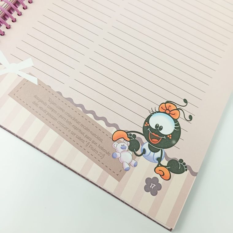 Contém 64 páginas ilustradas com textos bíblicos e também espaços, onde você poderá registrar o crescimento do bebê desde a gestação até ao primeiro ano de vida. No desejo de unir fatos e fotos, este diário foi preparado com muito amor para lhe ajudar a preservar os detalhes ocorridos na chegada desta nova vida preparada por Deus.