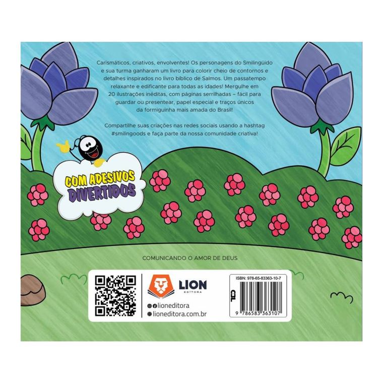 Os ensinamentos do livro bíblico de Salmos em ilustrações inéditas do Smilingüido e sua turma! Um livro para colorir delicado, cheio de detalhes e inspiração. Além do papel e acabamento especial, conta com páginas serrilhadas que permitem ao artista, se desejar, destacar, presentear ou guardar suas criações. Além disso, vem com uma página bônus com adesivos incríveis da formiguinha mais querida do Brasil. Um convite à um tempo de criatividade, relaxamento e diversão para todas as idades!